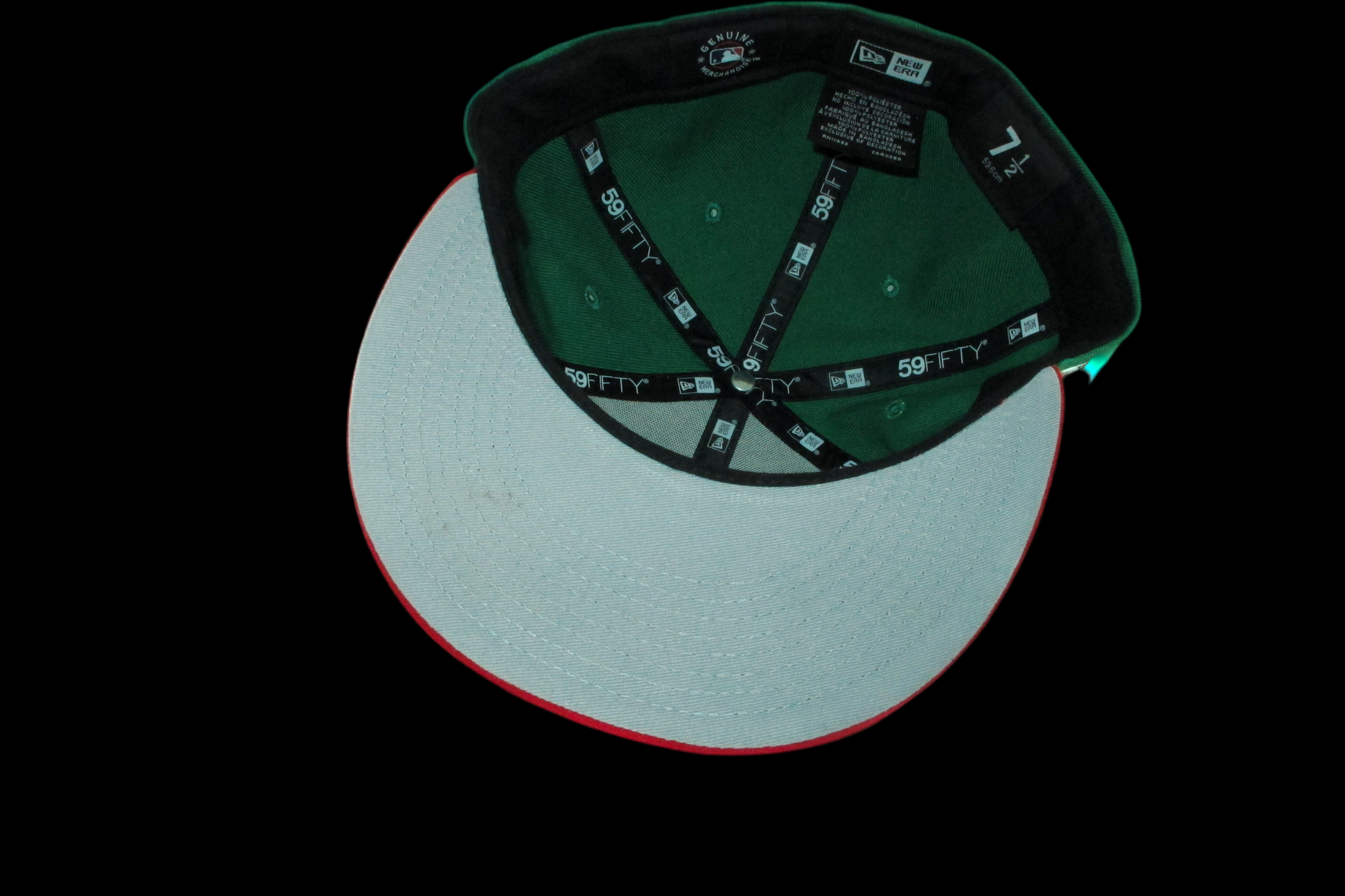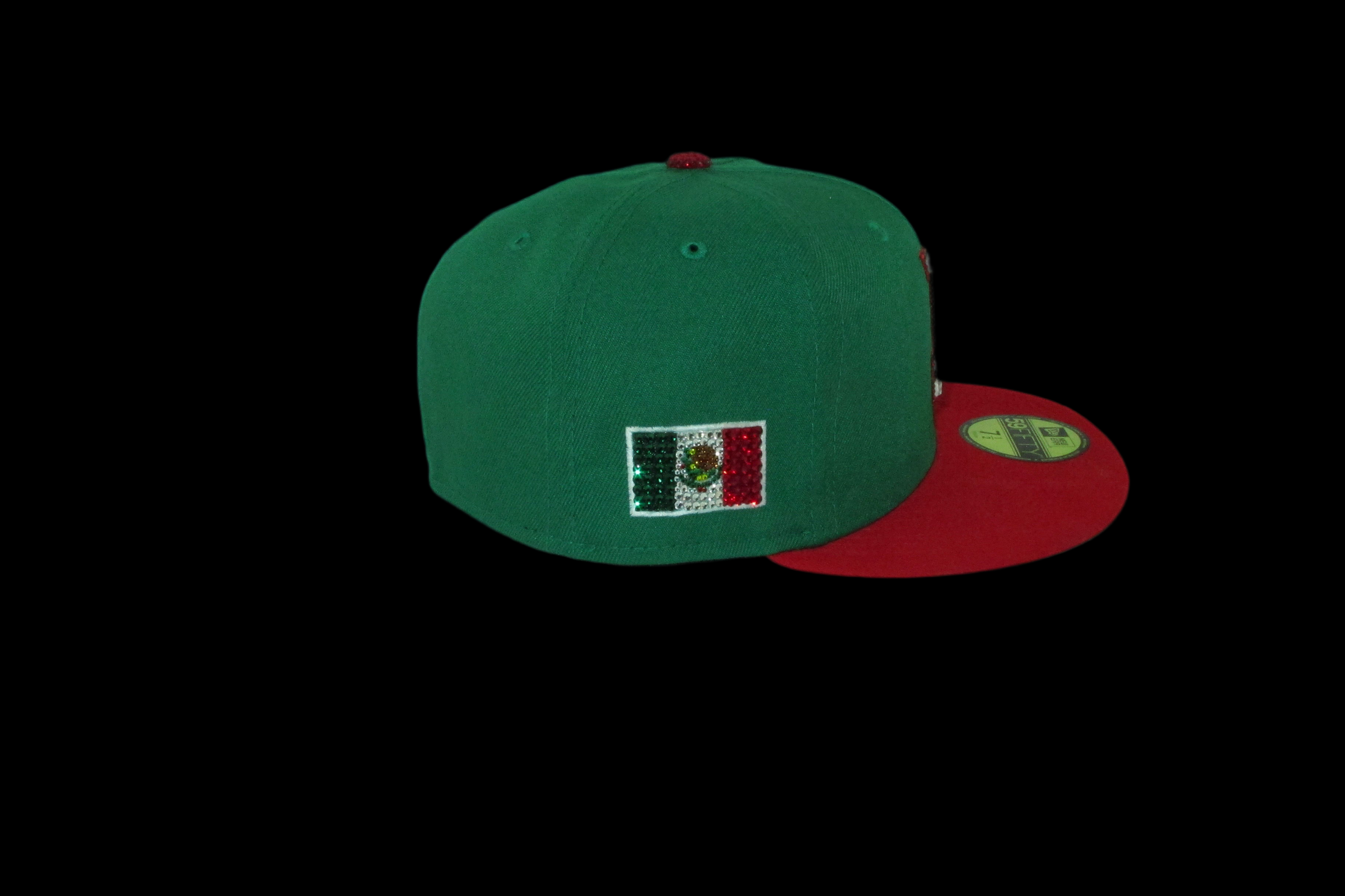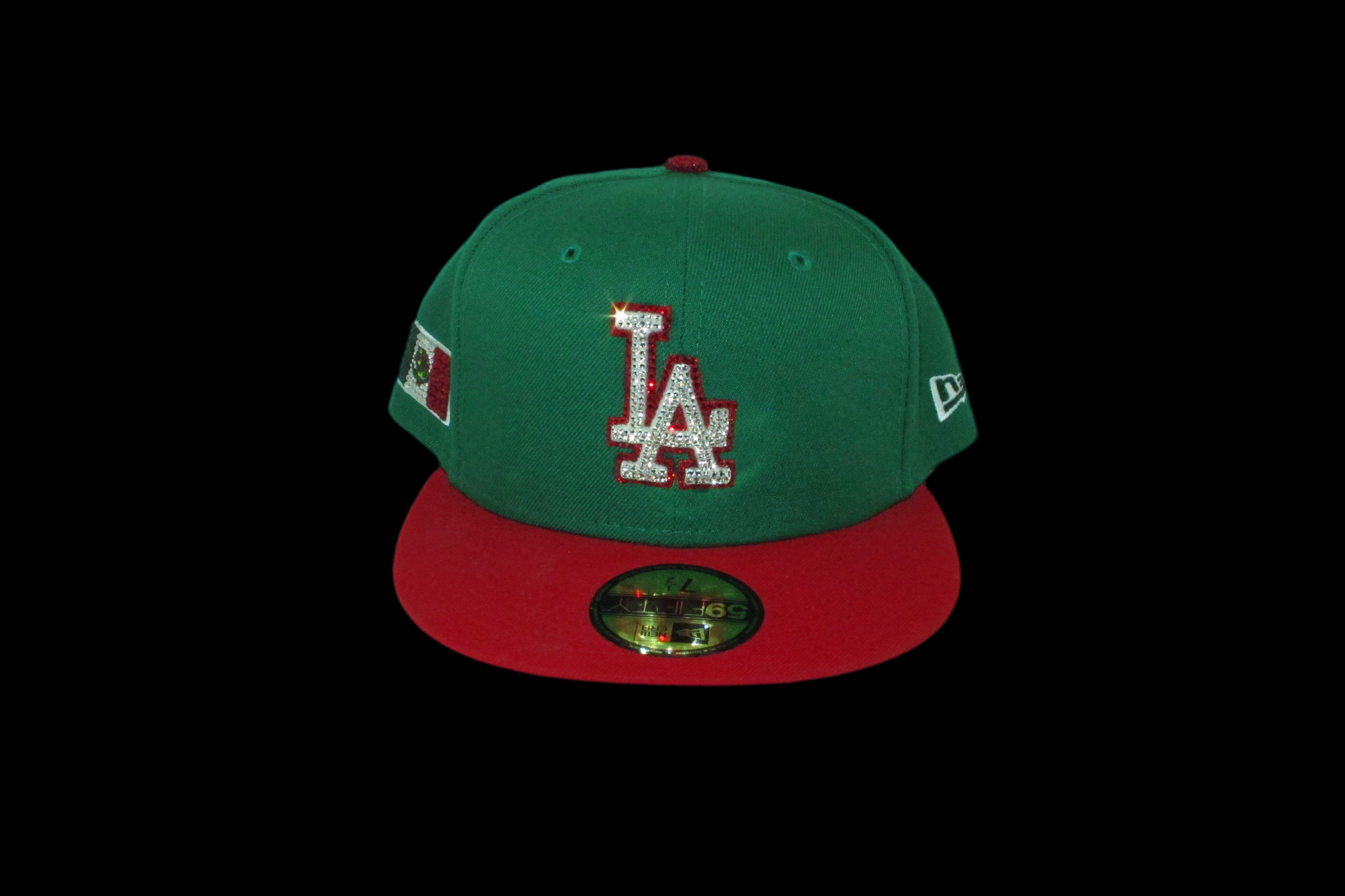An iced out Los Angeles Dodgers Mexico inspired fitted cap. It comes with an iced out batterman, New Era logo,  Mexico flag patch and a iced out red and white Los Angeles Dodgers front logo. It comes in the green and red colorway with a grey underbrim.