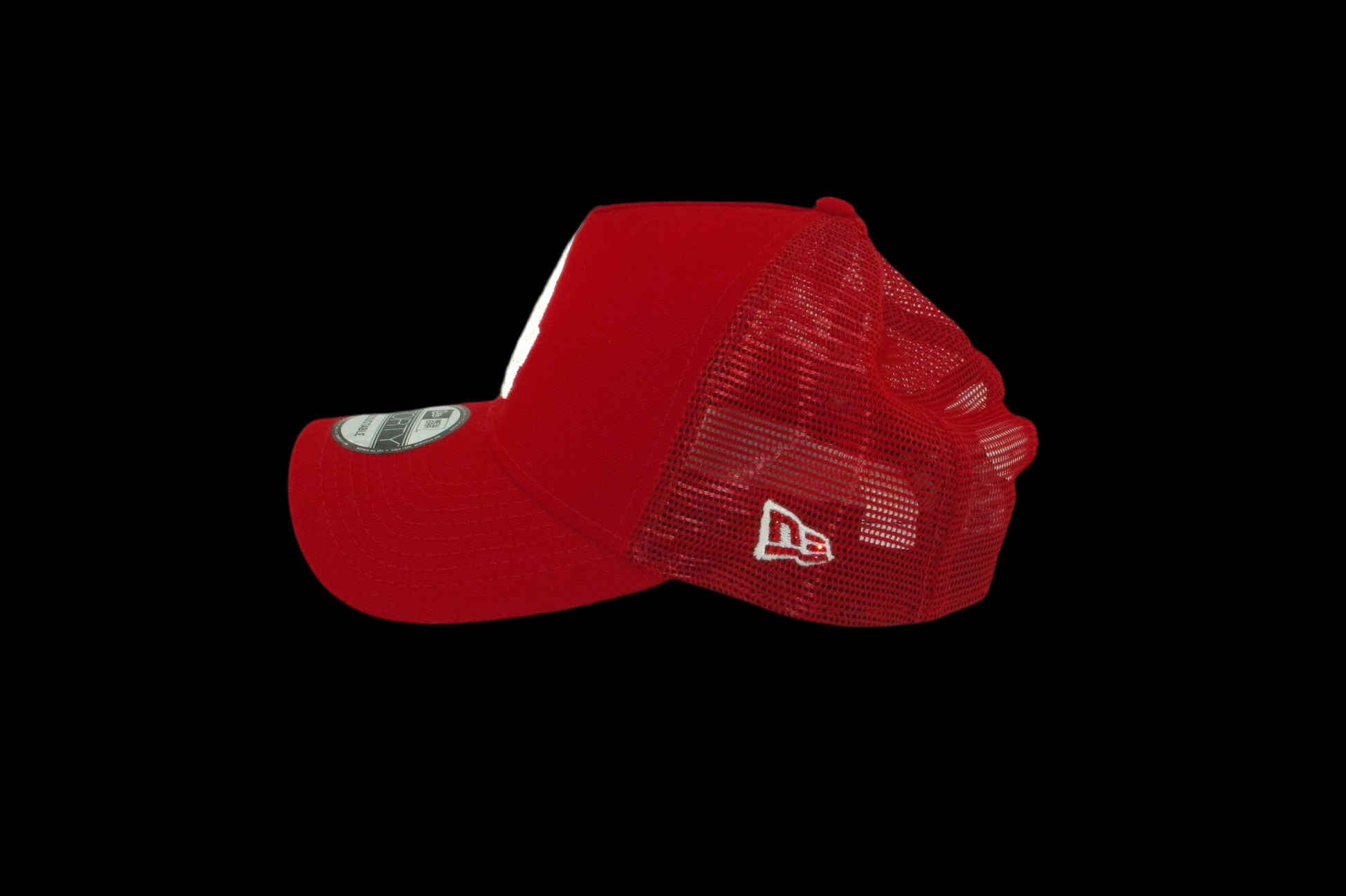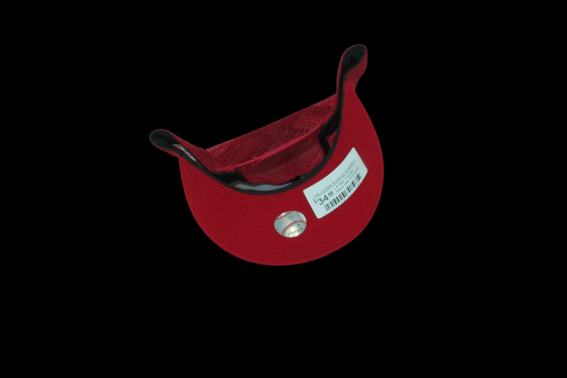 An iced out Los Ángeles Dodgers trucker snapback . It comes with an iced out Los Ángeles Dodgers front logo and a iced out new era logo. It comes in the red colorway with a red underbrim.