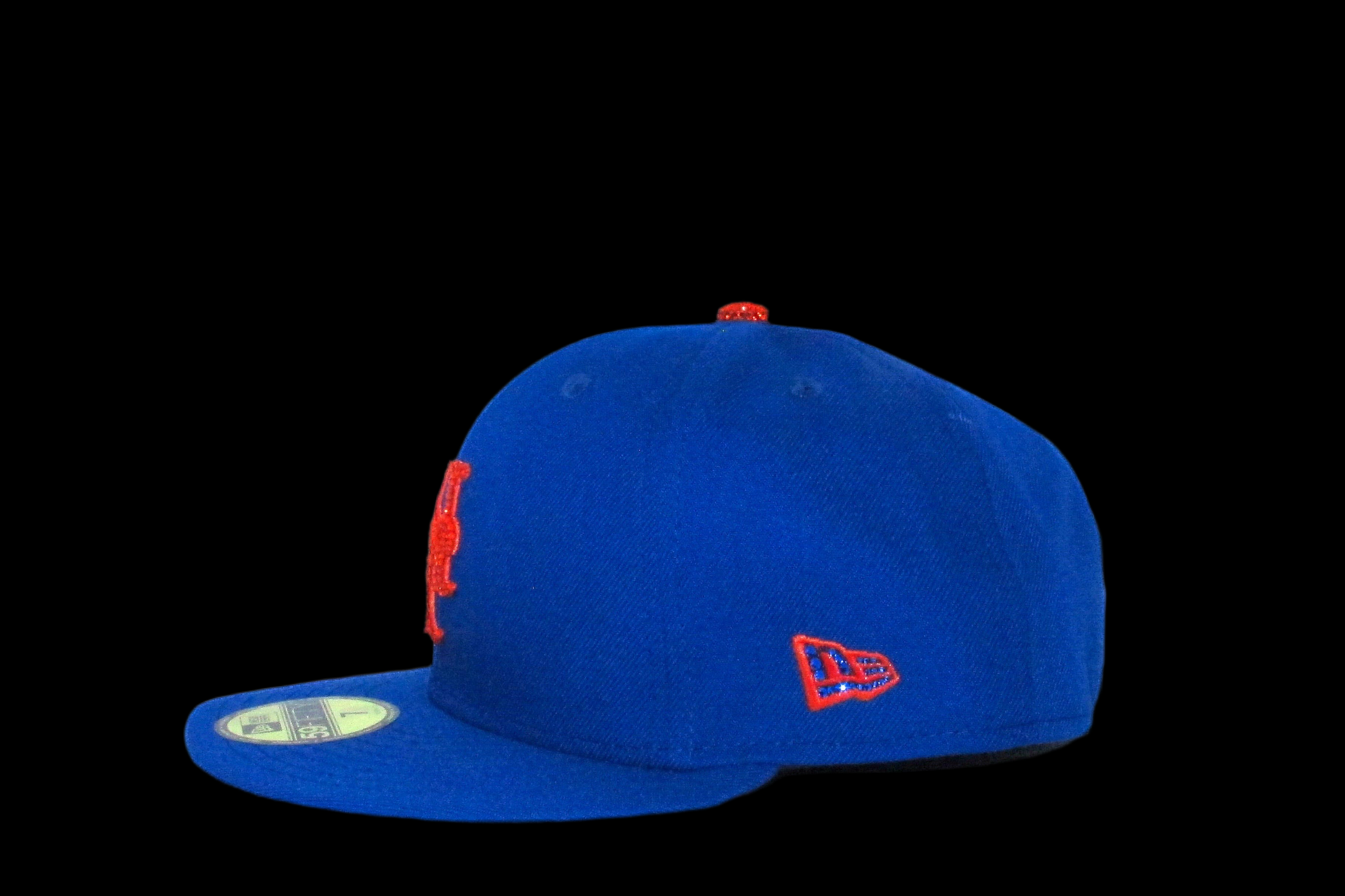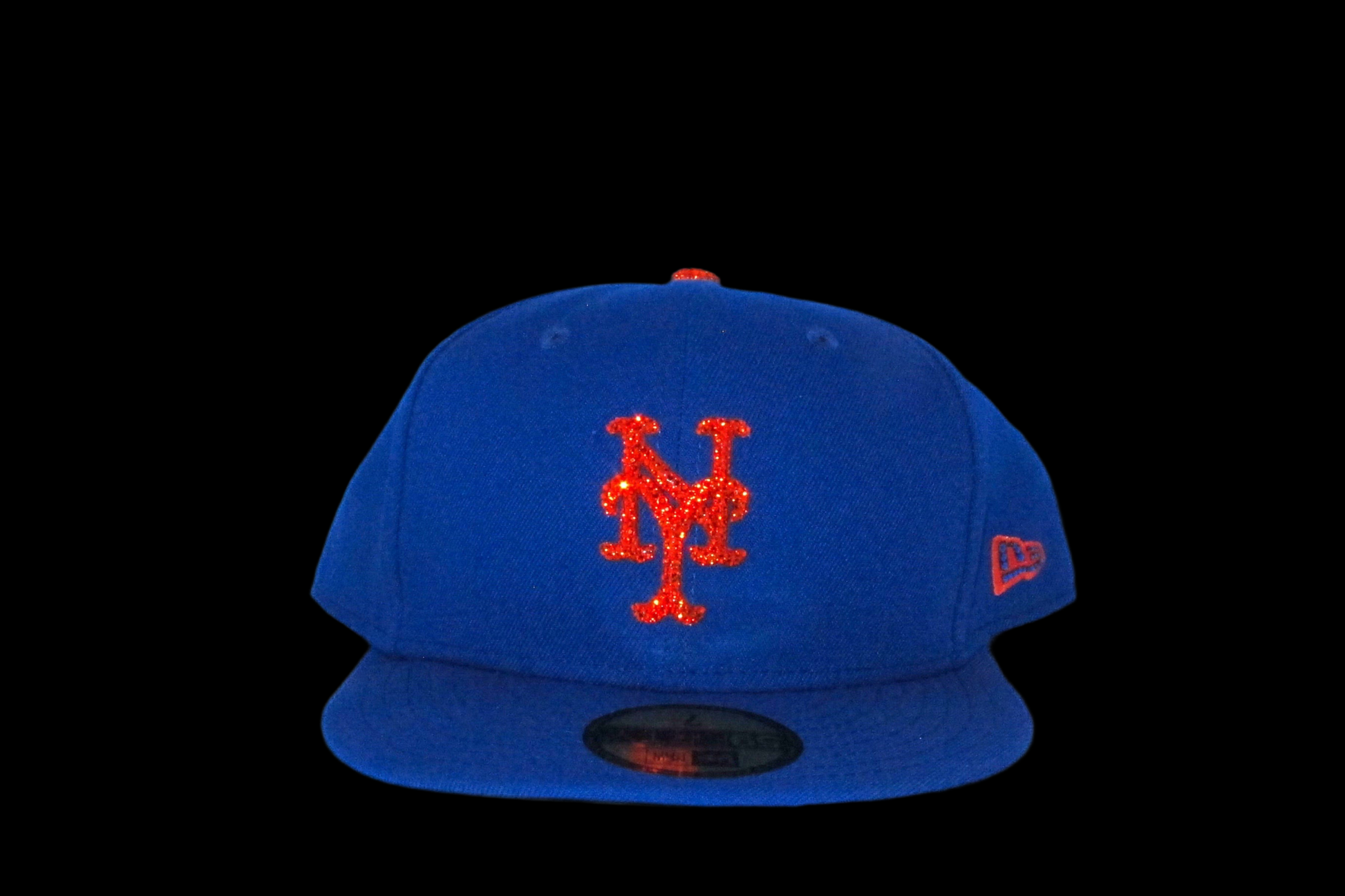 An iced out New York Mets fitted cap. It comes with an iced out batterman, New Era logo, an iced out top orange button and a iced out New York Mets front logo. It comes in the blue colorway with a grey underbrim.