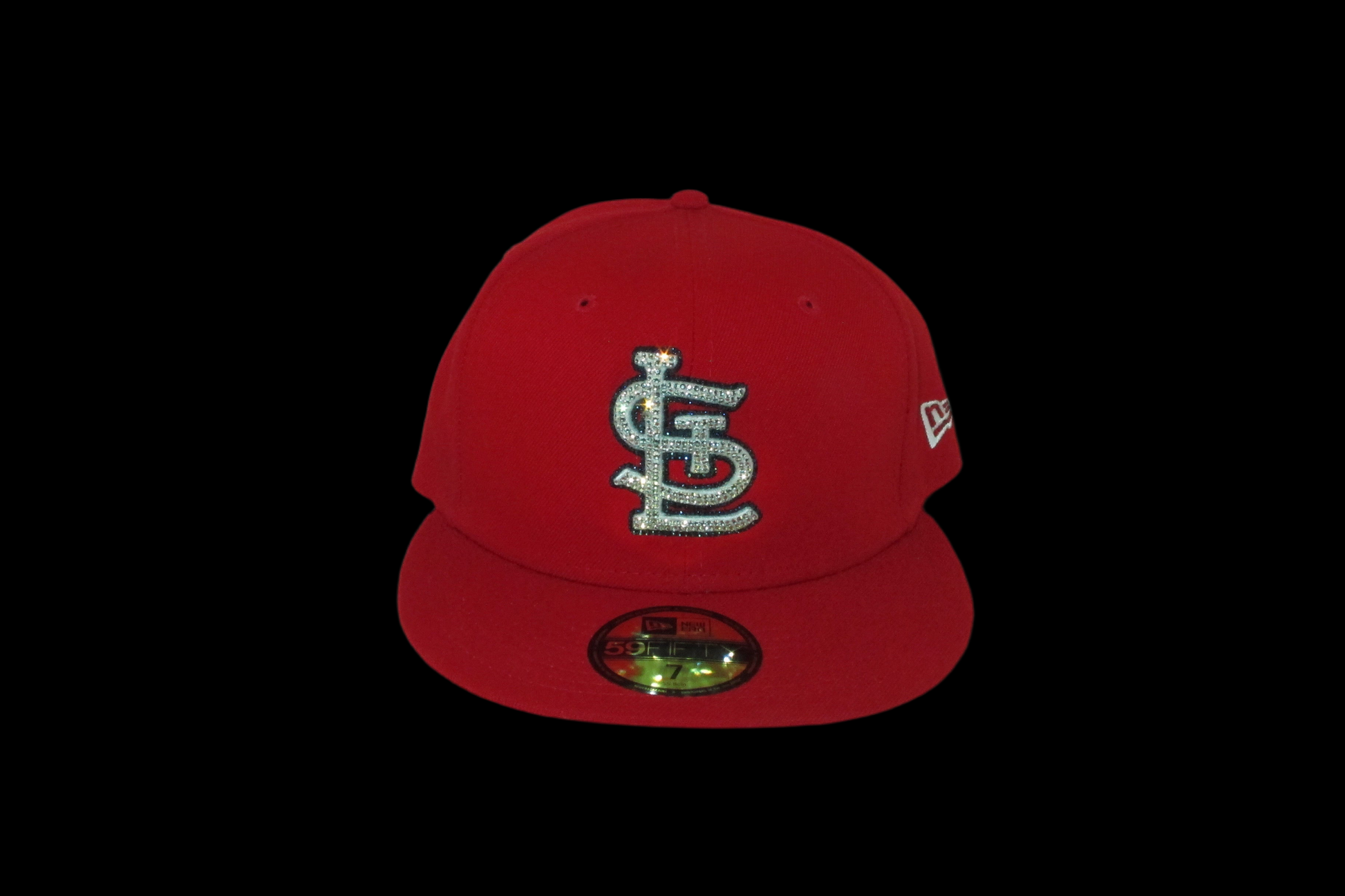 An iced out Saint Louis Cardinals fitted cap. It comes with an iced out batterman, New Era logo and a iced out Saint Louis Cardinals front logo. It comes in the red colorway with a grey underbrim.